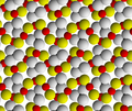 Malachite crystallizes in the monoclinic system. The structure consists of chains of alternating Cu2+ ions and OH− ions, with a net positive charge, woven between isolated triangular CO32− ions. Thus each copper ion is conjugated to two hydroxyl ions and two carbonate ions; each hydroxyl ion is conjugated with two copper ions; and each carbonate ion is conjugated with six copper ions.[14][15]