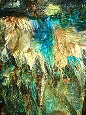 Mining for malachite for ornamental or copper ore purposes involves open-pit mining or underground mining depending on the grade of the ore deposits.[31] Open-pit and underground mining practices can cause environmental degradation through habitat and biodiversity loss.[32][33] Acid mine drainage can contaminate water and food sources to negatively impact human health if improperly managed or if leaks from tailing ponds occur.[33][34] The risk of health and environmental impacts of both traditional metallurgy and newer methods of hydrometallurgy are both significant,[33] however, water conservation and waste management practices for hydrometallurgy processes for ore extraction, such as for malachite, are stricter and relatively more sustainable.[35] New research is also being conducted on better alternatives to methods such as sulfuric acid leaching which has high environmental impacts, even under hydrometallurgy regulation standards and innovation.[30]