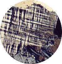 Photomicrograph of thin section of microcline showing crosshatched crystal twinning (in cross polarized light) |