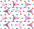 Like other members of the group monticellite and kirschsteinite have orthorhombic unit cells (space group Pbnm) shown in Figure 1. Iron and magnesium ions are located on the M1 inversion sites and calcium ions occupy the M2 site on mirror planes. The unit cell is somewhat larger than for the calcium free olivines forsterite and fayalite with