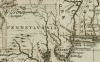 By the time that European colonization of the Americas began, several Native American tribes inhabited the region.[12] The Lenape spoke an Algonquian language, and inhabited an area known as the Lenapehoking, which was mostly made up of the state of New Jersey, but incorporated a lot of surrounding area, including eastern Pennsylvania. Their territory ended somewhere between the Delaware and Susquehanna rivers, within the state bounds. The Susquehannock spoke an Iroquoian language and held a region spanning from New York to West Virginia, that went from the area surrounding the Susquehanna River all the way to the Allegheny and Monongahela Rivers (about level with modern-day Pittsburgh).[14] European disease and constant warfare with several neighbors and groups of Europeans weakened these tribes, and they were grossly outpaced financially as the Hurons and Iroquois blocked them from proceeding into Ohio during the Beaver Wars. As they lost numbers and land, they abandoned much of their western territory and moved closer to the Susquehanna River and the Iroquois and Mohawk to the north. Northwest of the Allegheny River was the Iroquoian Petun,[15] known mostly for their vast Tobacco plantations, although this is believed to be complete fabrication.[16] They were fragmented into three groups during the Beaver Wars—the Petun of New York, the Wyandot of Ohio and the Tiontatecaga of the Kanawha River in southern West Virginia. South of the Alleghany River was, allegedly, a nation existed known as the Calicua.[17] They may have been the same as the Monongahela Culture and very little is known about them, except that they were probably a Siouan culture. Archaeological sites from this time in this region are scarce and the very few historical sources even mention them—most of these sources only coming from those who met Calicua traders further east on the Allegheny.