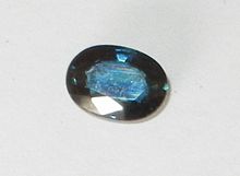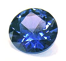 Sapphire is a precious gemstone, a variety of the mineral corundum, consisting of aluminium oxide (α-Al2O3) with trace amounts of elements such as iron, titanium, chromium, vanadium, or magnesium. The name sapphire is derived from the Latin "saphirus" and the Greek "sapheiros", both of which mean blue. It is typically blue, but natural "fancy" sapphires also occur in yellow, purple, orange, and green colors; "parti sapphires" show two or more colors. Red corundum stones also occur, but are called rubies not sapphires.[2] Pink-colored corundum may be classified either as ruby or sapphire depending on locale. Commonly, natural sapphires are cut and polished into gemstones and worn in jewelry. They also may be created synthetically in laboratories for industrial or decorative purposes in large crystal boules. Because of the remarkable hardness of sapphires – 9 on the Mohs scale (the third hardest mineral, after diamond at 10 and moissanite at 9.5) – sapphires are also used in some non-ornamental applications, such as infrared optical components, high-durability windows, wristwatch crystals and movement bearings, and very thin electronic wafers, which are used as the insulating substrates of special-purpose solid-state electronics such as integrated circuits and GaN-based blue LEDs. Sapphire is the birthstone for September and the gem of the 45th anniversary. A sapphire jubilee occurs after 65 years.[3]
