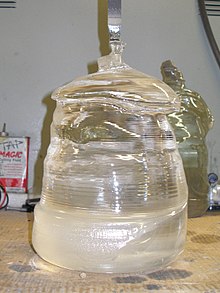 In 1902, the French chemist Auguste Verneuil announced a process for producing synthetic ruby crystals.[47] In the flame-fusion (Verneuil process), fine alumina powder is added to an oxyhydrogen flame, and this is directed downward against a ceramic pedestal.[48] Following the successful synthesis of ruby, Verneuil focussed his efforts on sapphire. Synthesis of blue sapphire came in 1909, after chemical analyses of sapphire suggested to Verneuil that iron and titanium were the cause of the blue color. Verneuil patented the process of producing synthetic blue sapphire in 1911.[49][4]: 254–255