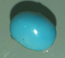 Hardness and richness of colour are two of the major factors in determining the value of turquoise; while colour is a matter of individual taste, generally speaking, the most desirable is a strong sky to robin egg blue (in reference to the eggs of the American robin).[20] Whatever the colour, for many applications, turquoise should not be soft or chalky; even if treated, such lesser material (to which most turquoise belongs) is liable to fade or discolour over time and will not hold up to normal use in jewellery.