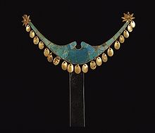 The Ancient Egyptian use of turquoise stretches back as far as the First Dynasty and possibly earlier; however, probably the most well-known pieces incorporating the gem are those recovered from Tutankhamun's tomb, most notably the Pharaoh's iconic burial mask which was liberally inlaid with the stone. It also adorned rings and great sweeping necklaces called pectorals. Set in gold, the gem was fashioned into beads, used as inlay, and often carved in a scarab motif, accompanied by carnelian, lapis lazuli, and in later pieces, coloured glass. Turquoise, associated with the goddess Hathor, was so liked by the Ancient Egyptians that it became (arguably[clarification needed]) the first gemstone to be imitated, the fair structure created by an artificial glazed ceramic product known as faience.