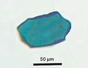 The wadsleyite minerals generally have a microcrystalline texture and are fractured. Because of small crystal size, detailed optical data could not be obtained; however, wadsleyite is anisotropic with low first-order birefringence colors.[10] It is biaxial with a mean refractive index of n = 1.76 and has a calculated specific gravity of 3.84. In X-ray powder diffraction, its strongest points in pattern are: 2.886(50)(040), 2.691(40)(013), 2.452(100,141), 2.038(80)(240), 1.442(80)(244).[10]