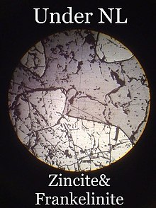 Zincite is the mineral form of zinc oxide (ZnO). Its crystal form is rare in nature; a notable exception to this is at the Franklin and Sterling Hill Mines in New Jersey, an area also famed for its many fluorescent minerals. It has a hexagonal crystal structure and a color that depends on the presence of impurities. The zincite found at the Franklin Furnace is red-colored, mostly due to iron and manganese dopants, and associated with willemite and franklinite.